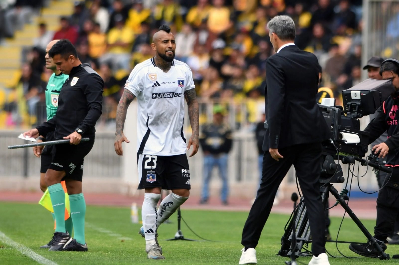 Fernando Ortiz, técnico de Colo Colo, al ser consultado por Vidal cuando no está en la cancha y ha dado instrucciones al equipo.