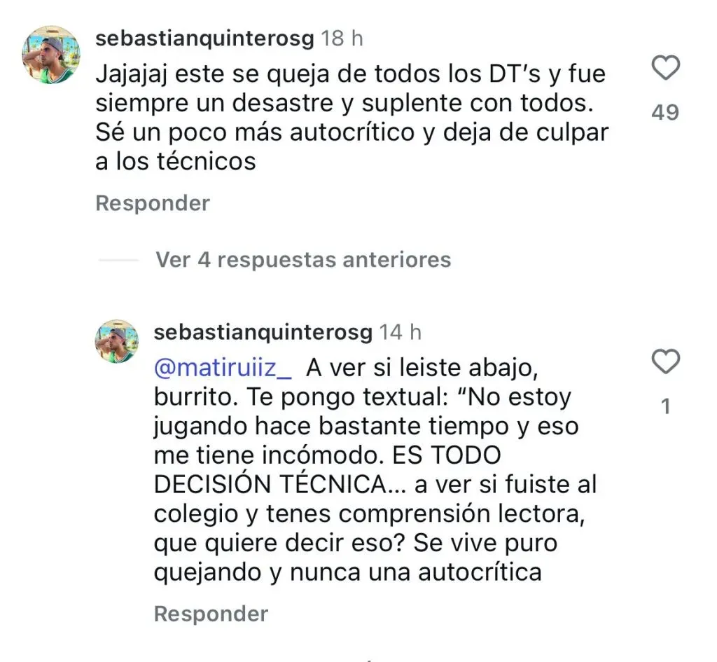 Sebastián Quinteros a través de un comentario en la publicación de Dale Albo en Instagram, se lanzó contra el atacante nacionalizado chileno.